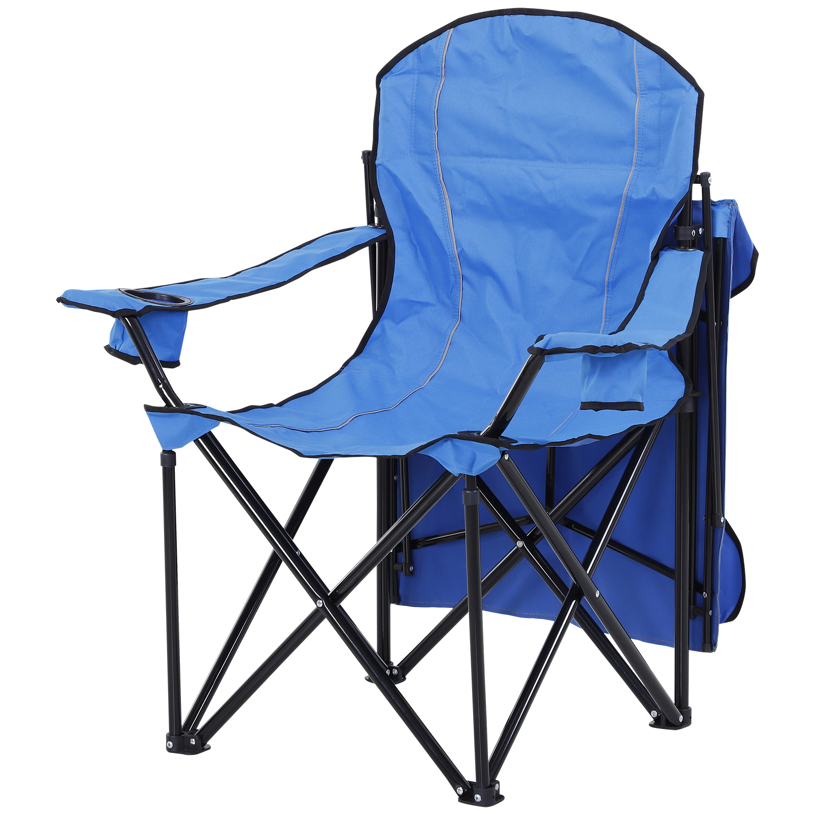 Metal folding chairs contain special features such as buckles and straps, cushioned back.